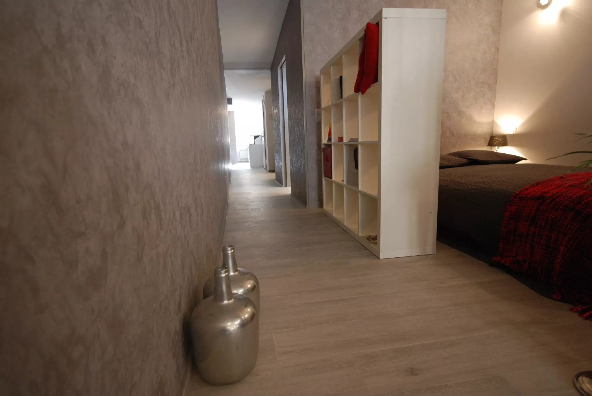 Au centre , une chambre ouverte, mais idéalement séparée de la cuisine et du séjour, une salle de douche spacieuse avec lavabo-meuble, WC, armoire de rangement et colonne de lavage-séchage.