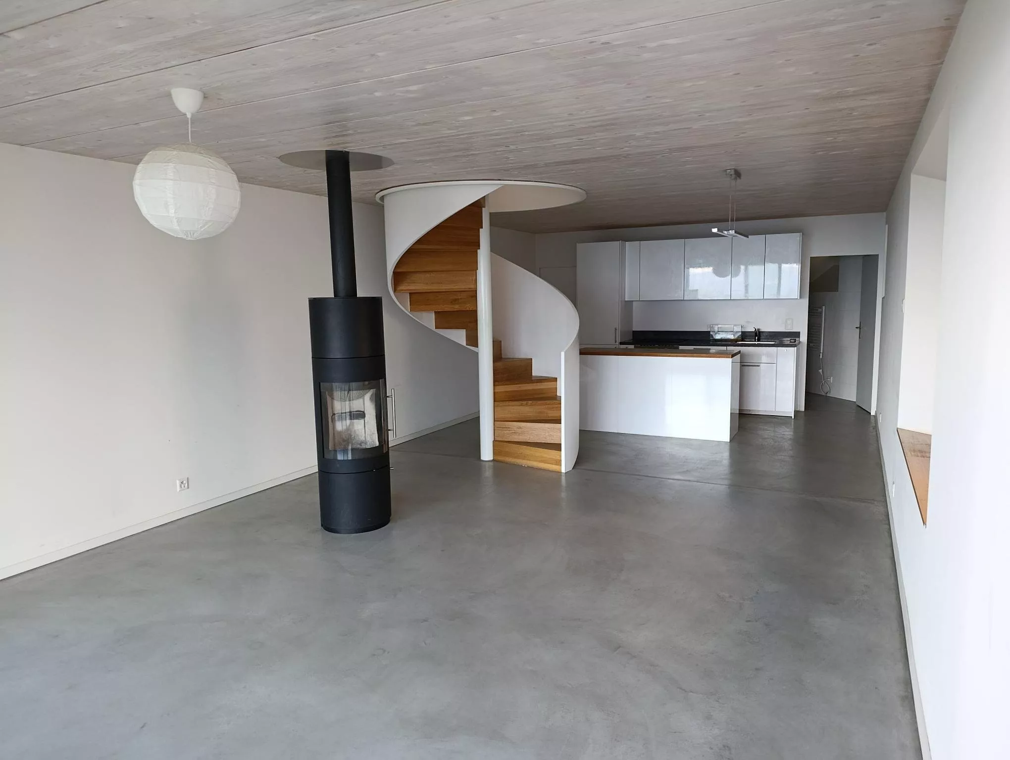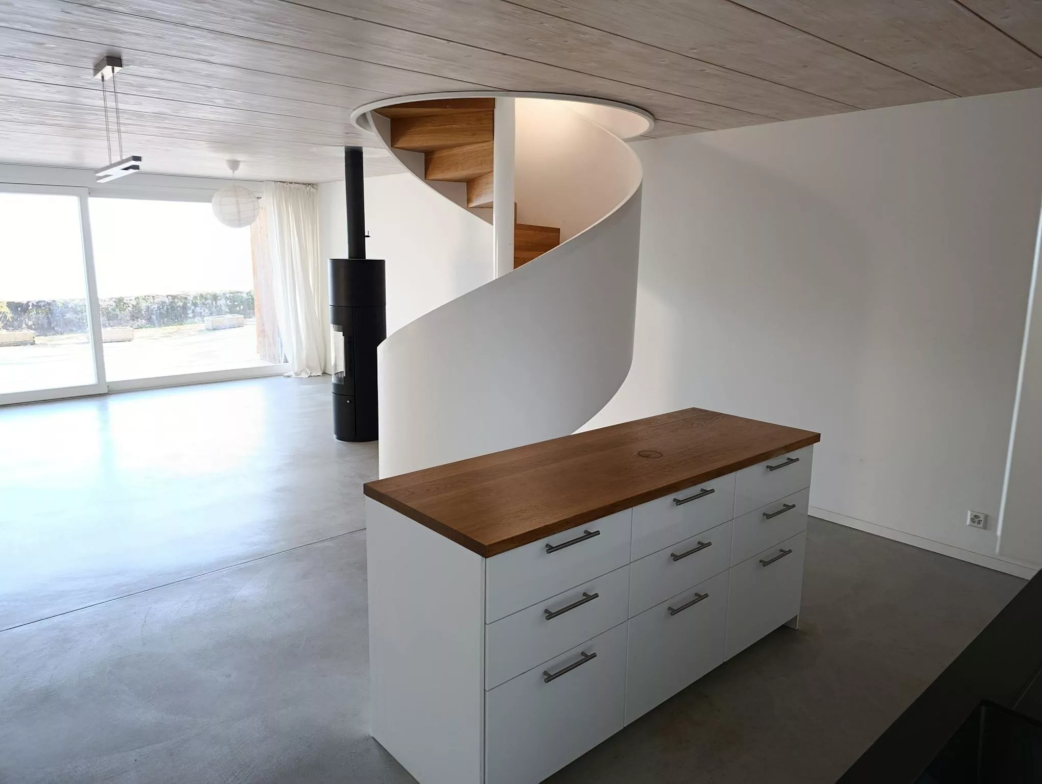 Grand séjour lumineux avec poêle et baie vitrée donnant sur l'extérieur, incluant une charmante petite terrasse avec magnifique vue